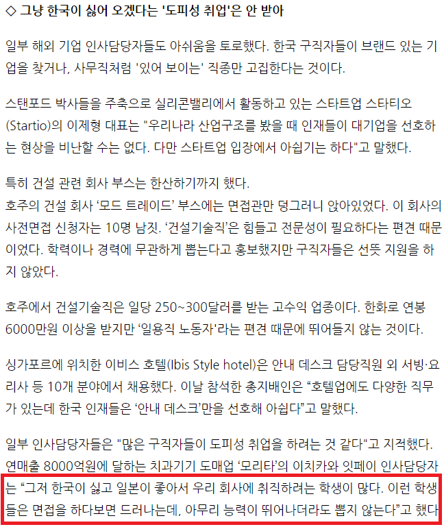그러므로 '한국은 별로고 일본이 좋다' 같은 뉘앙스를 풍기면 풍길 수록 '아, 쟤는 자기네 나라에서도 적응 못하는 애구나, 뭔 말을 저렇게 하냐'라고 생각하고 안 뽑으려고 한다는 겁니다.