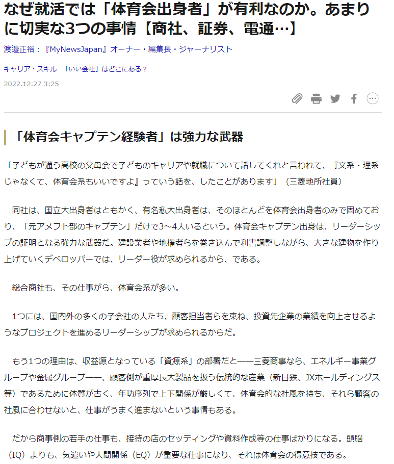 위 기사에서도 나오지만 소위 중공업이라고 불리는 산업은 물론 상사, 건설업 등도 '똑똑하지만 대체적으로 시키는 대로 잘 하고 사교성이 좋은'인재를 원하고 그게 딱 체육회 출신자라는 겁니다. 이중에서도 리더십 경험까지 있는 주장(캡틴, キャプテン)이라면 더더욱 좋은 스펙이 되고요.